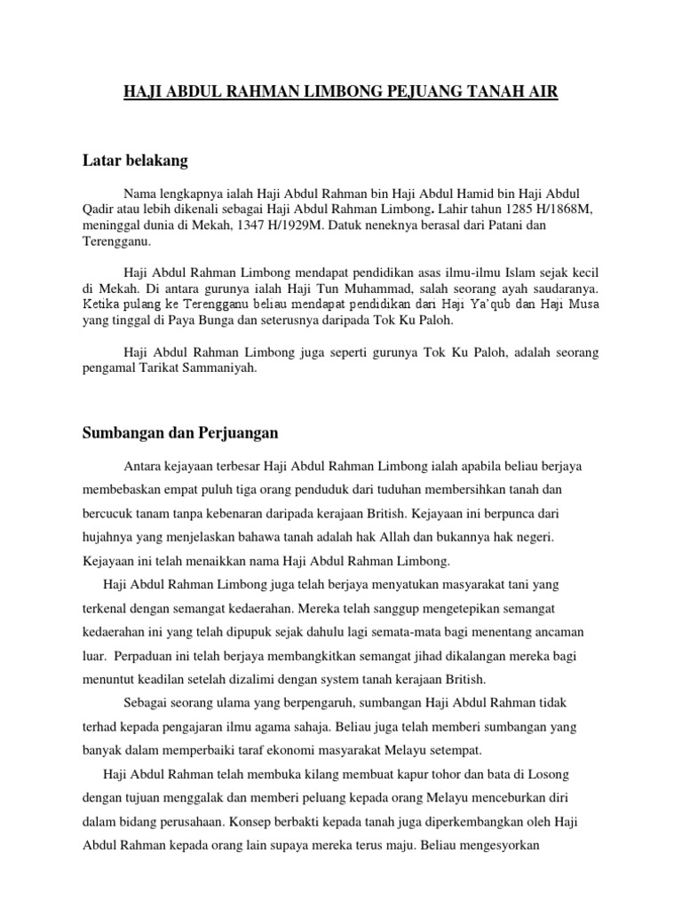 Standard malay warriors in essay questions bakar al bakir dan kepimpinan. Haji abdul rahman limbong had spread his business to countries abroad namely menara, southern thai to sell his boat there (abdullah zakaria bin ghazali haji abdul rahman limbong had taken extra measures to defend those who were penalised. British had regarded him as a rebel. Biodata haji abdul rahman limbong nama : Open land isbirthday biodata haji abdul. 1922'de haji abdul rahman limbong, izinsiz çiftçilik yaptığı için mahkemede yargılanan 43 çiftçiden birini temsil etti. Alhamdulilah 12 hari bulan 6 (jumaat) surau limbong akan buke. See more of surau tuan haji abdul rahman limbong on facebook. From 1922 until 1928, he was a resistance leader seeking to resist laws and changes introduced by the british. The present study investigates haji abdul rahman. Haji abdul rahman limbong, terengganu. You don't have permissions to access this page. Solat berjemaah dibenarkan mulai 12 jun.