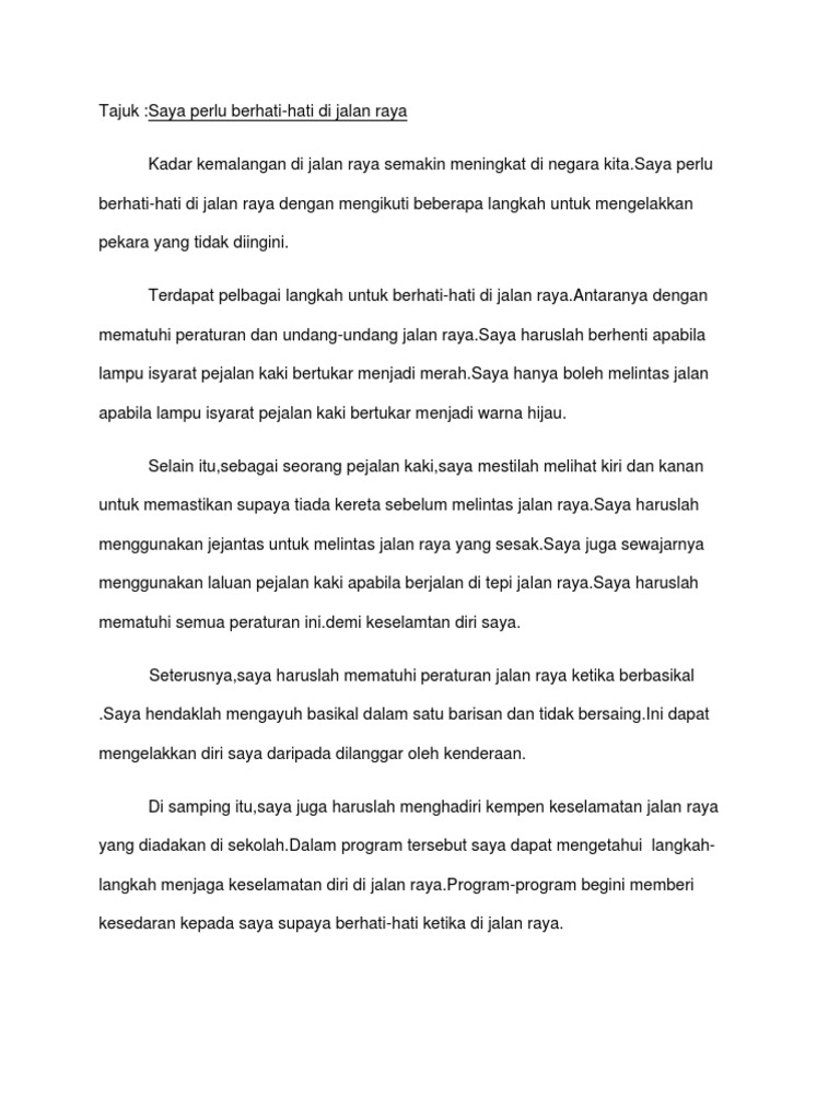 Aku menggorak langkah meninggalkan perkarangan sekolah. Karangan ceramah keselamatan jalan raya (the duty of care and negligence) tugasan soalan: Pihak kelab telah menjemput seorang pegawai polis lalu lintas untuk menyampaikan ceramah tentang keselamatan murid sekolah di jalan raya semasa perhimpunan rasmi mingguan. Kenderaan perlulah diperiksa terlebih dahulu sebelum memulakan perjalanan. Hal ini kerana semua rakyat di malaysia akan melakukan perjalanan jauh sarna ada pulang ke kampung ataupun pergi melancong.