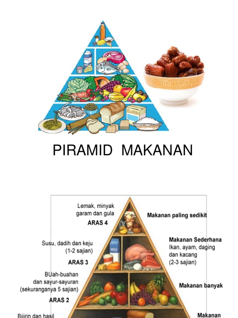Makan Secara Sihat from image.slidesharecdn.com Ikuti artikel ini untuk mengetahui dengan lebih lanjut piramid makanan ini dahulunya berfungsi sebagai panduan diet umum yang sihat untuk kebanyakan individu. Piramid makanan ini akan memudahkan kita untuk mempelbagaikan makanan harian kita dengan berpandukan kepada sajian yang disarankan. Piramid makanan juga digunakan sebagai panduan dalam penyediaan makanan sihat. 1 binaan atau tugu peringatan (khususnya di mesir) yg bertapak empat segi dan permukaan sisinya berbentuk tiga segi yg menirus. Di malaysia, piramid makanannya mempunyai gabungan 5 jenis kumpulan makanan yang diletakkan pada 4 aras tingkat berbeza. Saiz setiap aras menentukan kadar jumlah peratus yang perlu diambil setiap hari bagi setiap kumpulan makanan tersebut. Piramid makanan merupakan panduan bagi memilih makanan secara sihat aras 3 susu dan tenusu kekacang ayam daging ikan fungsi protein membaiki tisu badan membina sel baru untuk pertumbuhan membekalkan tenaga penghasilan bahan kimia seperti hormon pembentukan tulan. Makanan seimbang seharusnya memberikan kita tenaga, makanan yang mencukupi, karbohidrat.