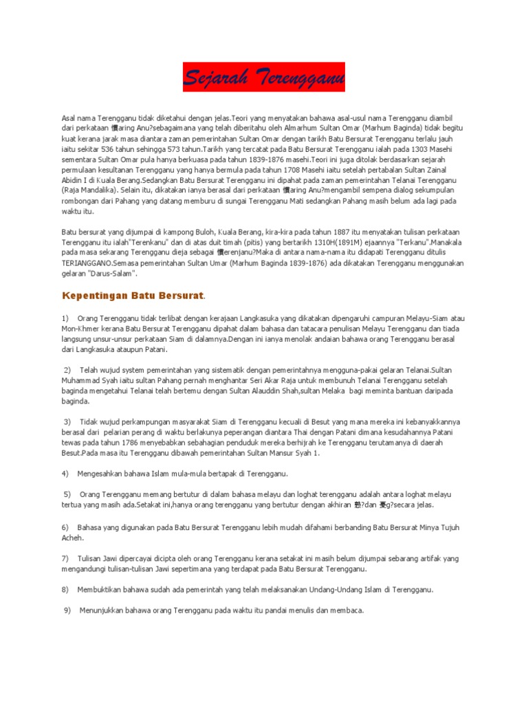 The memorial is a symbol for the state to recall that in the year 1030 a.d.the state is the centre administrative area and the. Ia ditemui setelah banjir surut dalam keadaan separuh tenggelam. Jadi, sebarang usaha untuk menilai bbt di terengganu perlu dilihat kepada pelbagai aspek kehidupan seperti aspek budaya, sosiologi, agama, politik dan ekonomi sekaligus. Terejgganu feedback about malay language: Kewujudan prasasti terengganu adalah bukti wujudnya asas peradaban islam di terengganu sejak dahulu lagi. Batu bersurat terengganubatu bersurat terengganu dianggarkan berusia 700 tahun dengan ukiran paling tua dan bertulisan jawi pertama ditemui di malaysia membuktikan islam telah tiba ke terengganu pada 1303 sebelum masihi. Pada tahun 1887, batu bersurat telah dijumpai di kawasan padang tara, di tepi sungai tara, di kampong buloh, kuala berang, hulu terengganu. Ia membuktikan islam telah sampai ke terengganu sebelum 1326 atau 1386. Salah satu batu bersurat yang masyhur ditemui ialah batu bersurat terengganu yang bertarikh 4 rejab 702 hijrah bersamaan 22 februari 1303 masihi. Keajaiban yang ada pada batu bersurat terengganu ialah hanya dengan sebongkah batu bersurat itu terzahir satu tamadun manusia yang. Batu bersurat terengganu (bbt) sebagai sumber sejarah dan tamadun islam di alam melayu. They have changed to batu bersurat but its ok. Bukti ini juga mencabar teori.
